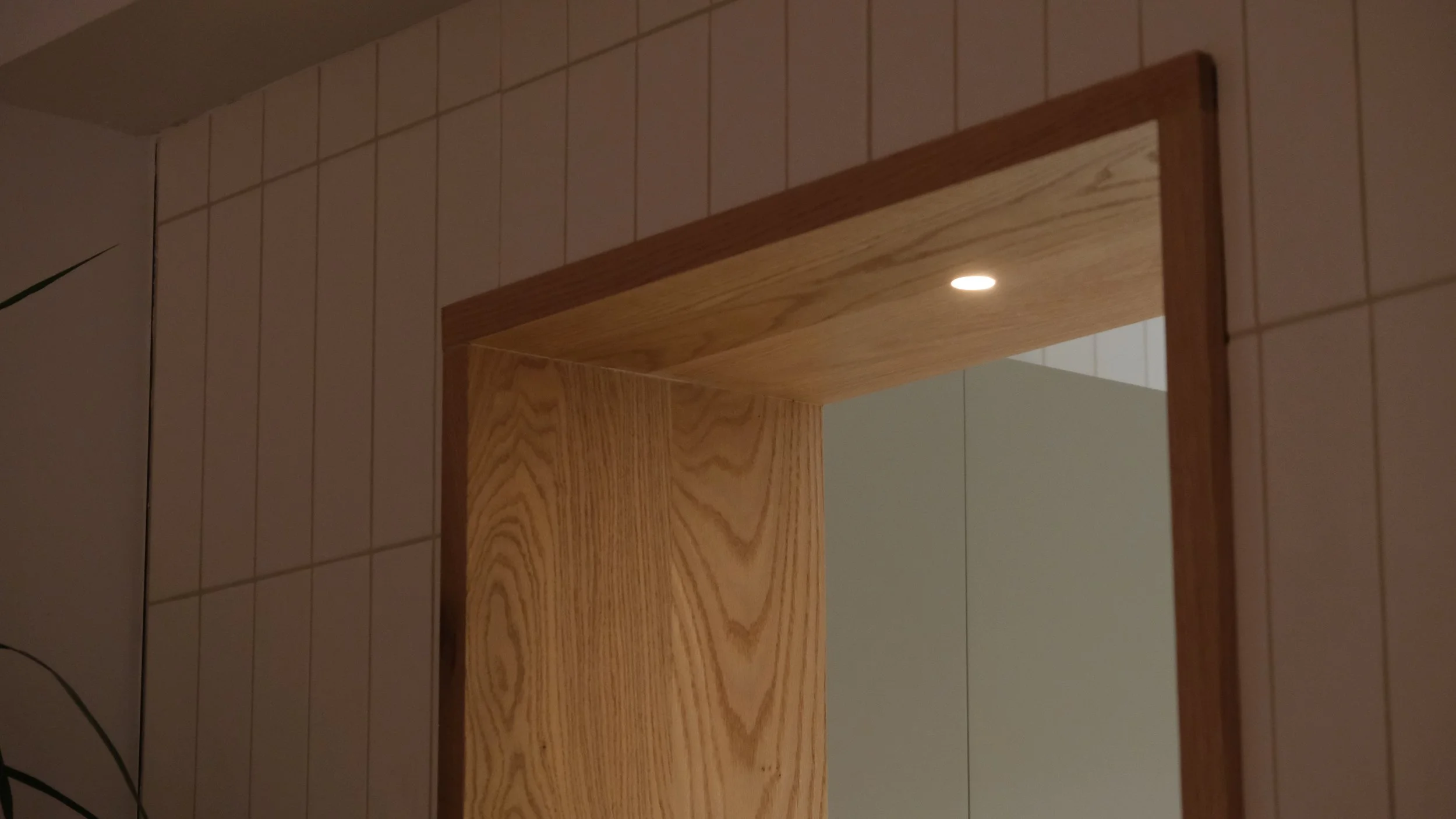 A window, from the kitchen to the dining room was unfinished in a client’s home, bare studs and drywall. We covered the window in red oak, to match existing built-ins, and added some character. A small hole was drilled to allow a pot light to shine, and some slots were added to allow for air to pass through.